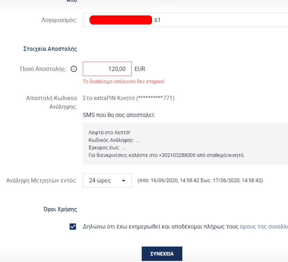 - Ο κωδικός μπορεί να χρησιμοποιηθεί μόνο μία φορά και μόνο για την ανάληψη του ποσού που έχει πληκτρολογήσει ο αποστολέας